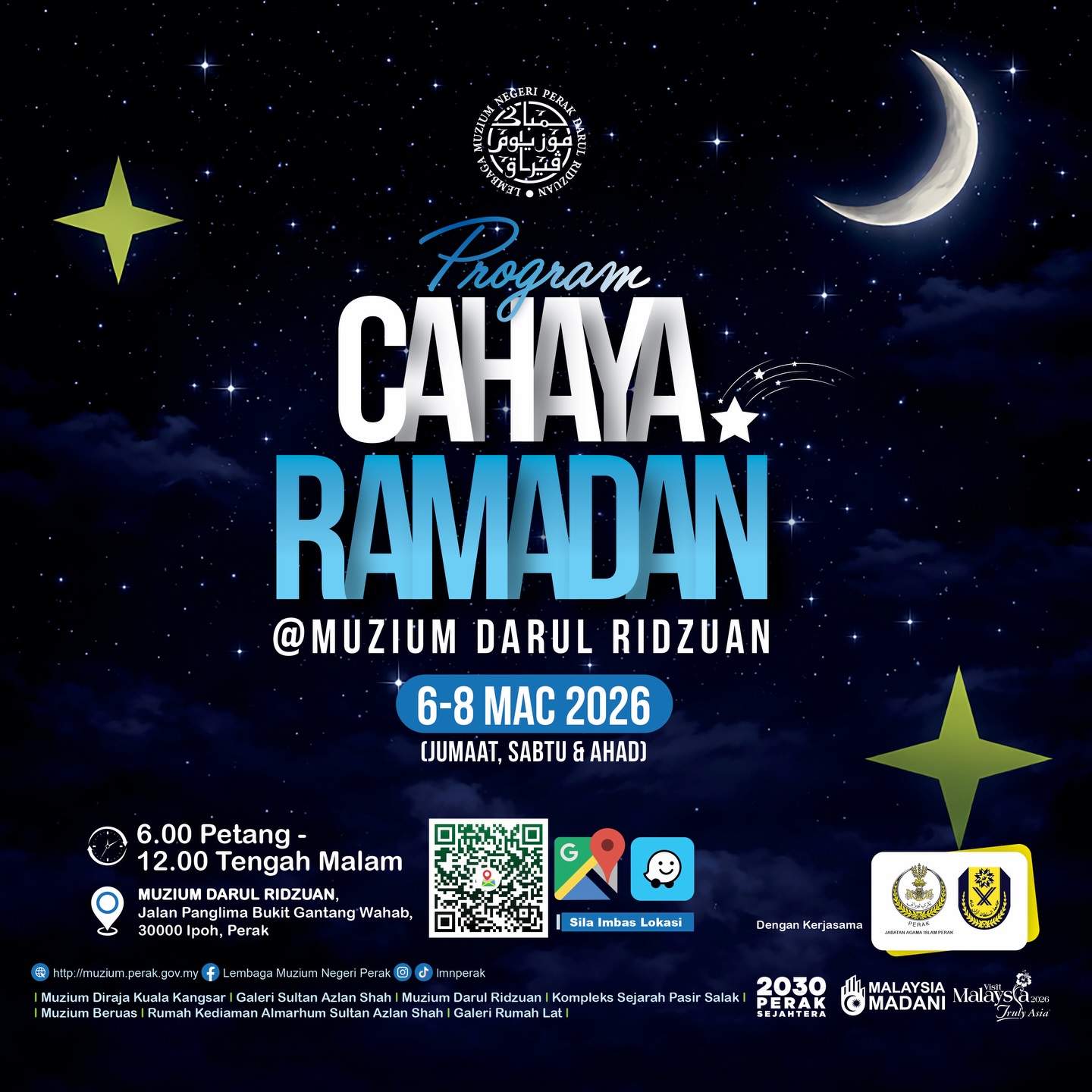 Lembaga Muzium Negeri Perak dengan penuh rasa teruja menjemput seluruh warga Ipoh dan sekitarnya untuk bersama-sama menyemarakkan Program Cahaya Ramadan @ Muzium Darul Ridzuan pada 6 hingga 8 Mac 2026 (Jumaat hingga Ahad), bermula jam 6.00 petang hingga 12.00 tengah malam di Muzium Darul Ridzuan.