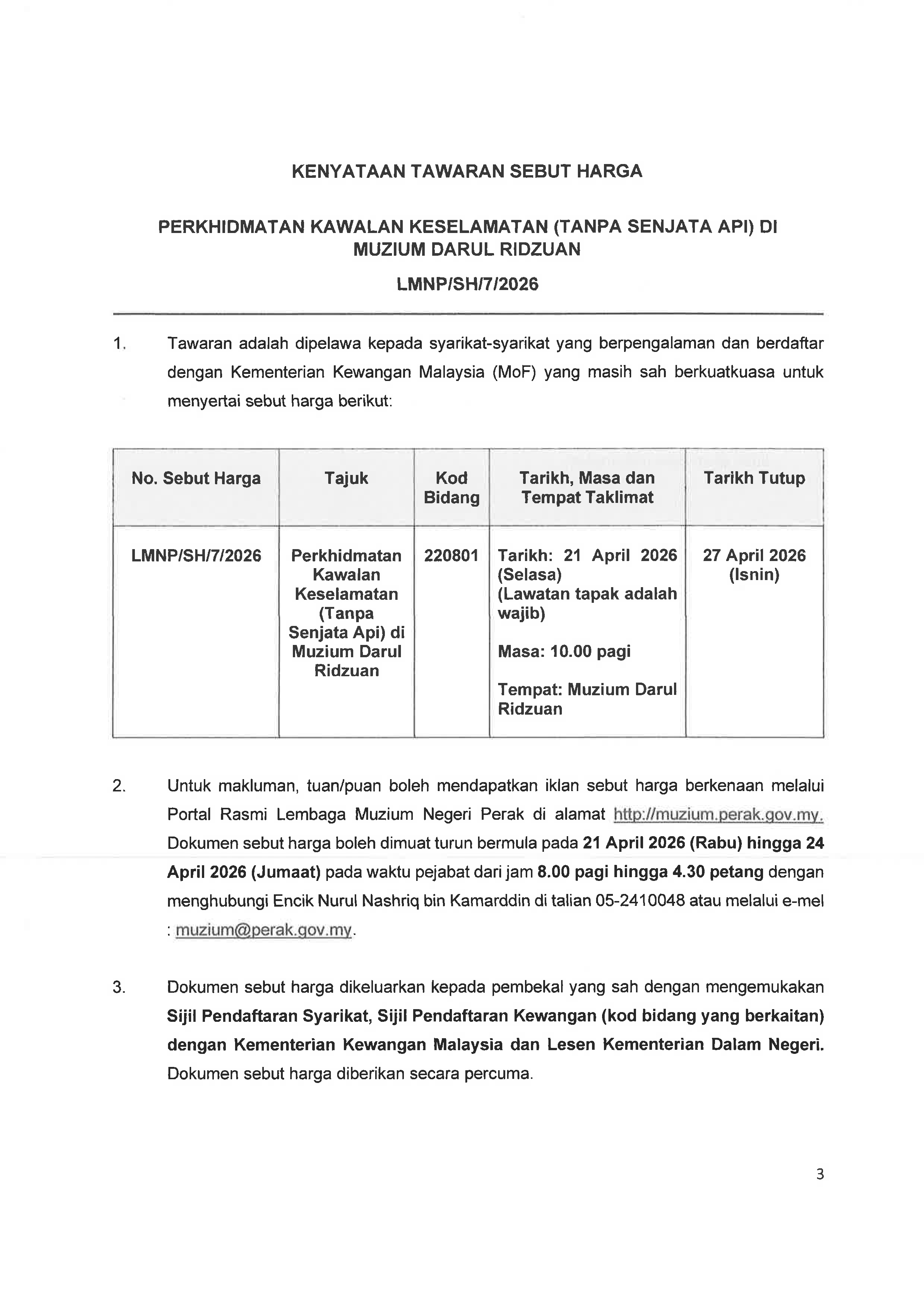 KENYATAAN TAWARAN SEBUT HARGA PERKHIDMATAN KAWALAN KESELAMATAN (TANPA SENJATA API) DI MUZIUM DARUL RIDZUAN