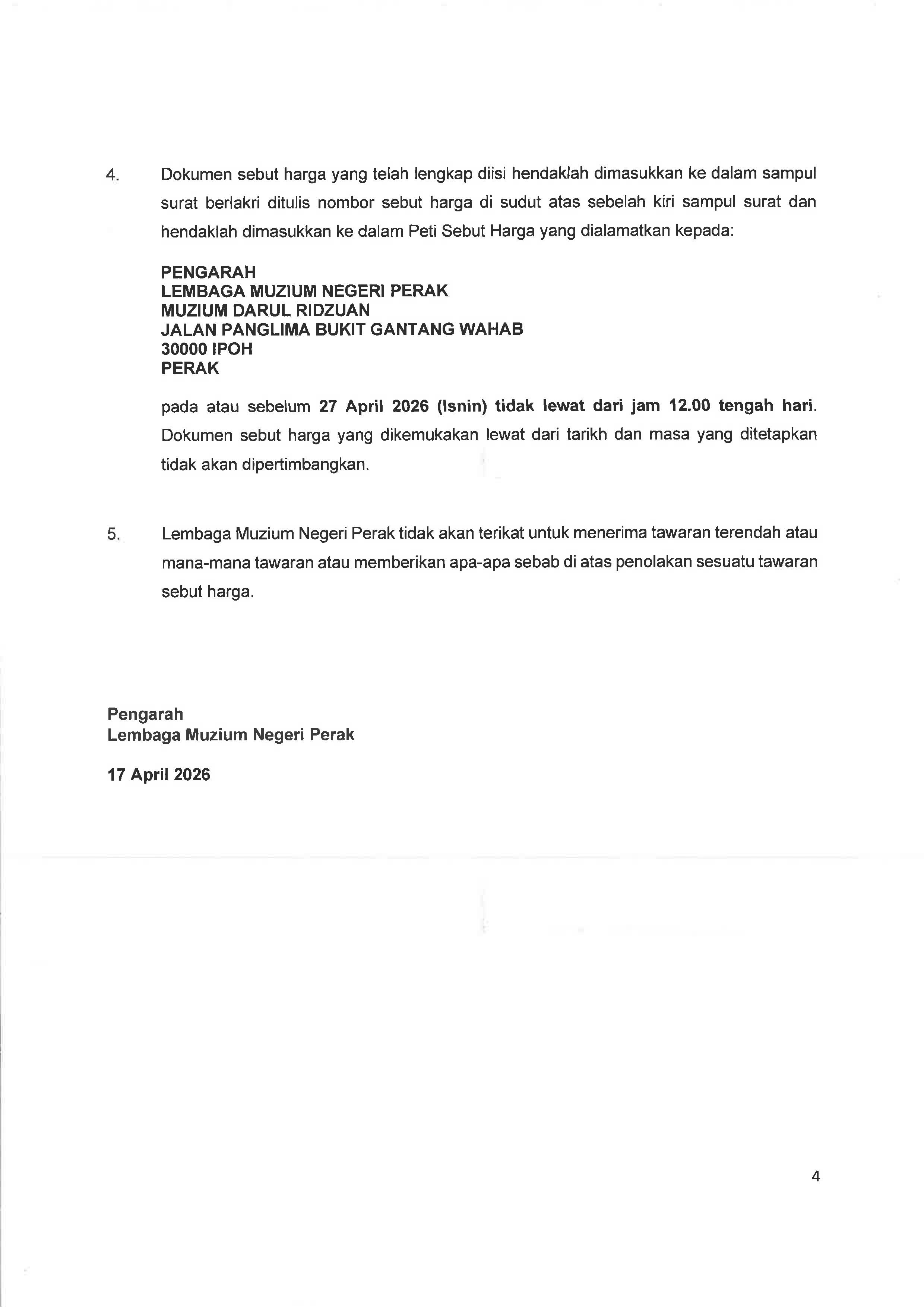TARIKH TUTUP : 27 APRIL 2026 (ISNIN) TIDAK LEWAT DARI JAM 12.00 TENGAH HARI.
